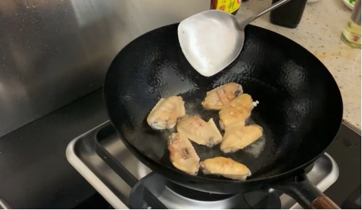 4.鍋熱油,放入雞翅煎至兩面微微焦黃。