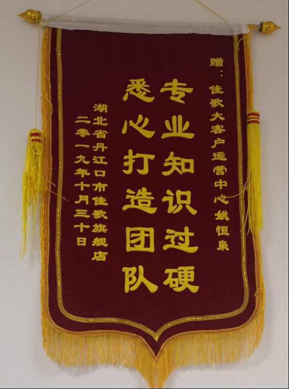 丹江口經(jīng)銷商為感謝佳歌大客戶運營中心對此次活動的悉心幫扶,特送來錦旗一面。加上之前獲得的三面錦旗,佳歌集成灶大客戶運營中心在成立短短時間內(nèi),已經(jīng)擁有四面錦旗。