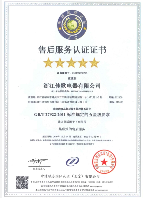 售后服務(wù)五星級認(rèn)證證書