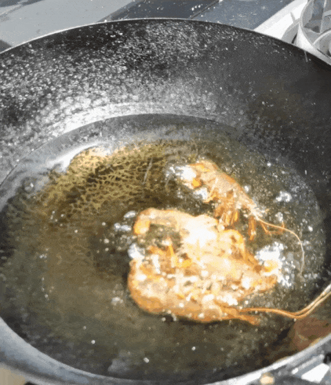 2. 用漏勺攪動幾下讓龍蝦均勻烹炸,待龍蝦表面變紅炸至半熟后,撈出盛盤備用。